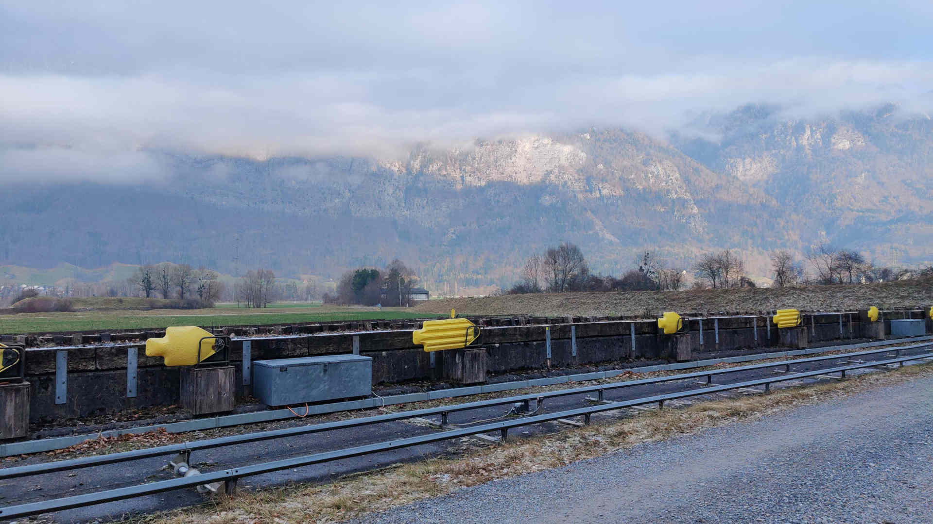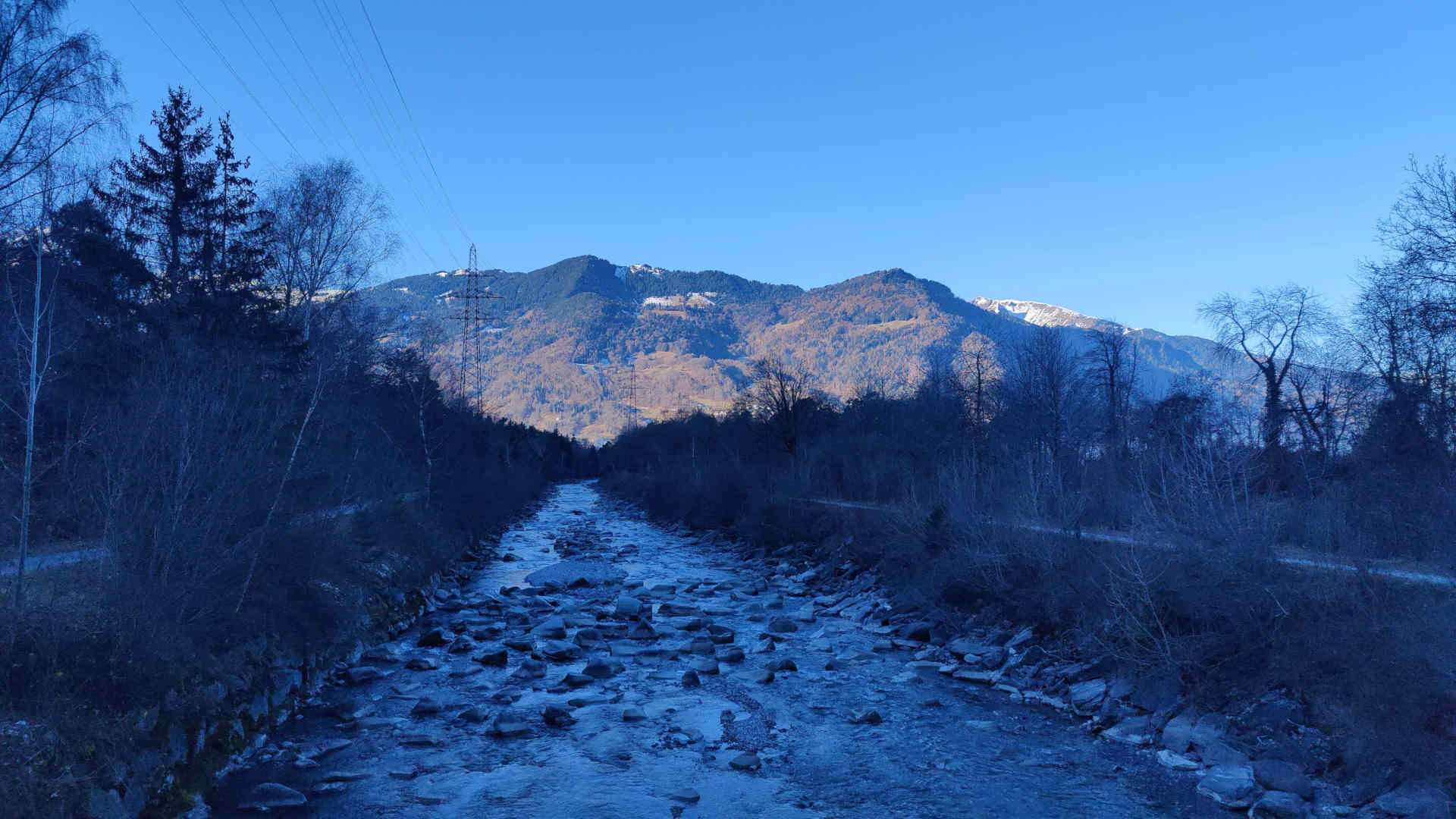 Die umliegenden Hänge kommen näher, die Sonne dafür leider wieder hinter dem Berg. Um halb zehn Uhr bin ich beim Tankshop. Eine kurze Rast und weiter geht es direkt zum Fluss Landquart. Steine liegen im Bach, rechts hohe Betonbauten. Die Zivilisation ist nahe, der Weg aber führt direkt zur Schlucht.