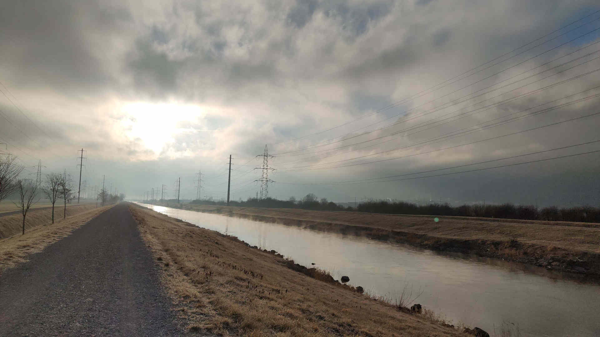 Am nächsten Morgen bin ich um acht Uhr in Schmerikon. Kurz ein Blick zum Obersee und schon war ich beim Linth-Kanal. Der Untergrund ist nicht geteert, aber doch hart gefroren. Vor mir erblicke ich eine fantastische Wolkenformation und erstmals Sonne. Kalt ist es trotzdem. Wer schneller läuft, der weniger friert.