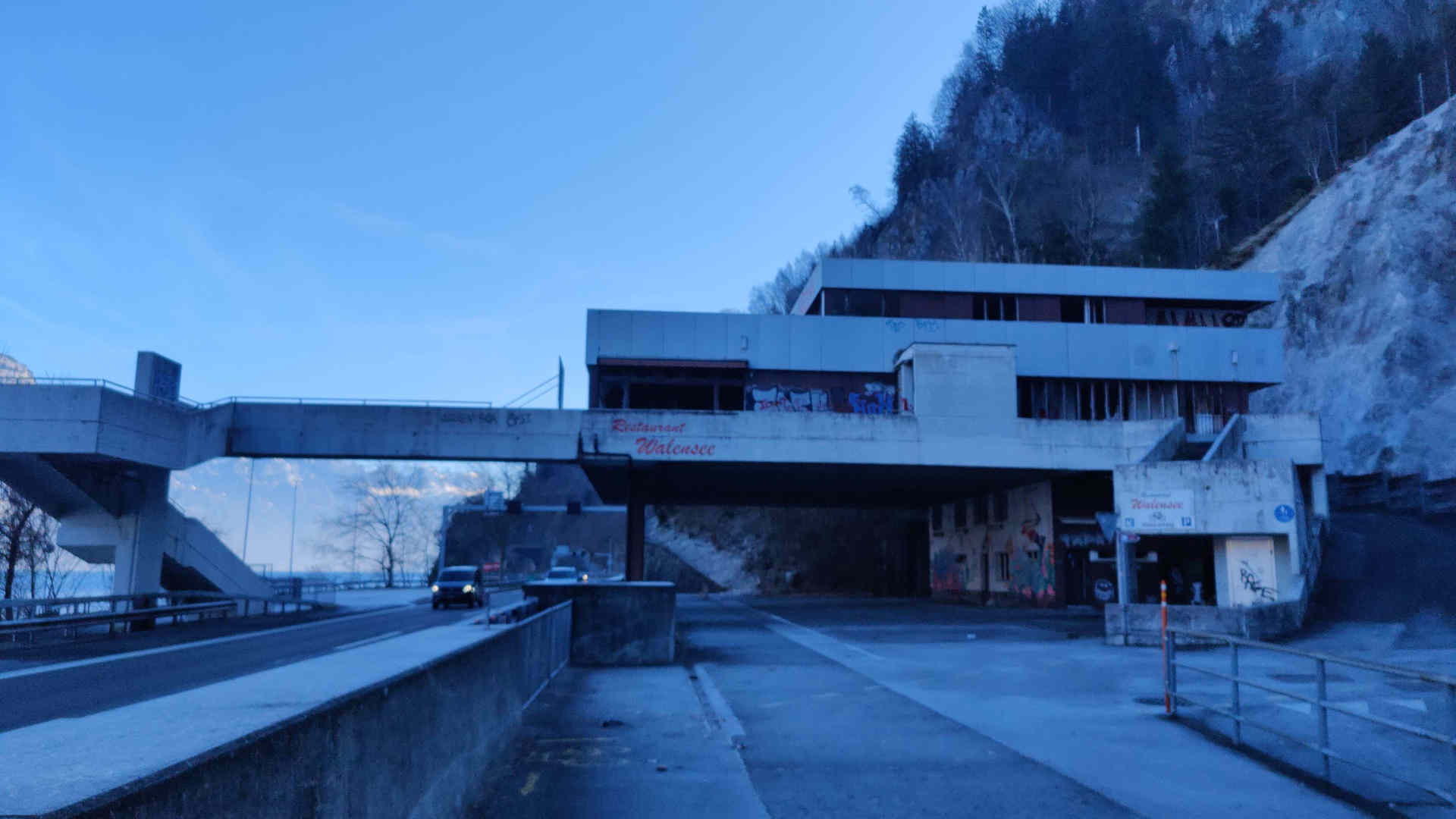 Unterwegs die längst geschlossene Raststätte von damals, als die Strasse noch nicht vierspurig war. Seit über 20 Jahren steht die Anlage leer. Einem aktuellen Artikel entnehme ich, dass der Zufahrtsstreifen für die Autos nach heutigen Vorstellungen zu kurz sei.