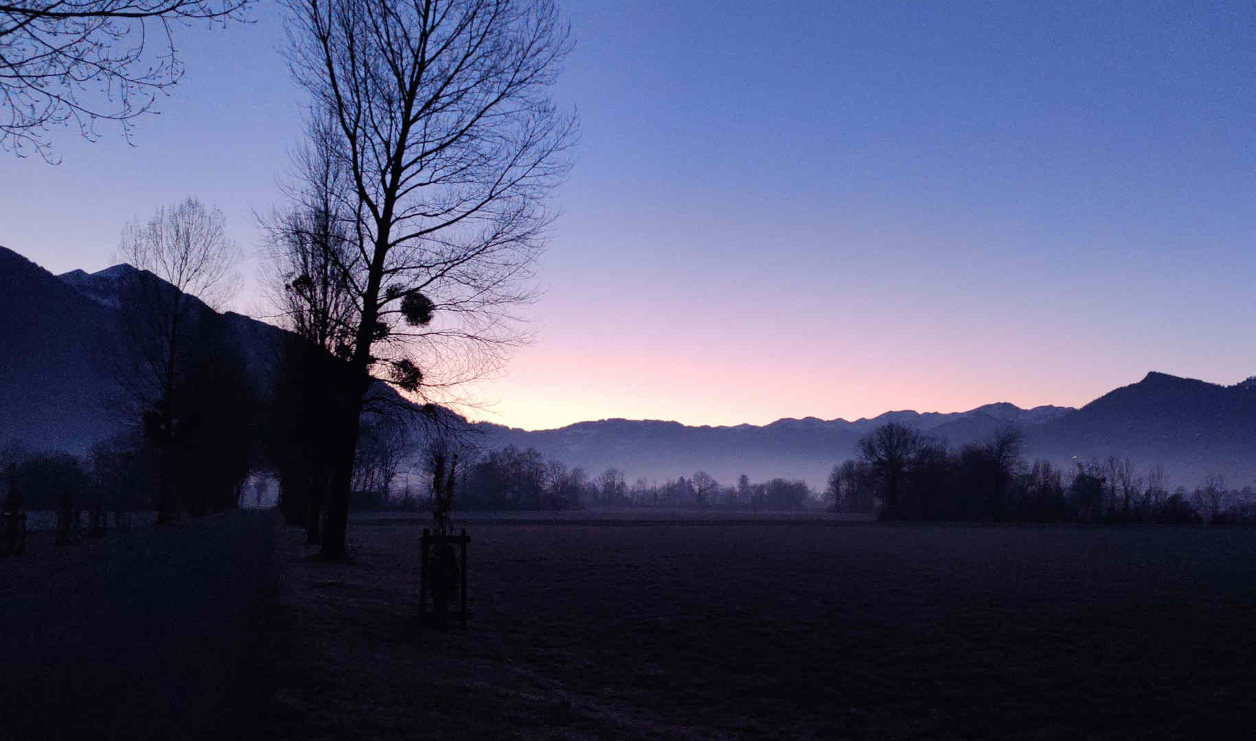 Unterwegs ein Kläffer von einem nahen Bauernhof. Quasi auf freier Wildbahn im Dunkeln, der Start verläuft nicht nach Plan. Ich fuchtle mit meinen beiden Stöcken wohl Minuten, ehe das Tier von dannen zieht. Später zur Versöhnung, ein Sonnenaufgang mit fantastischen Nebelschwaden.