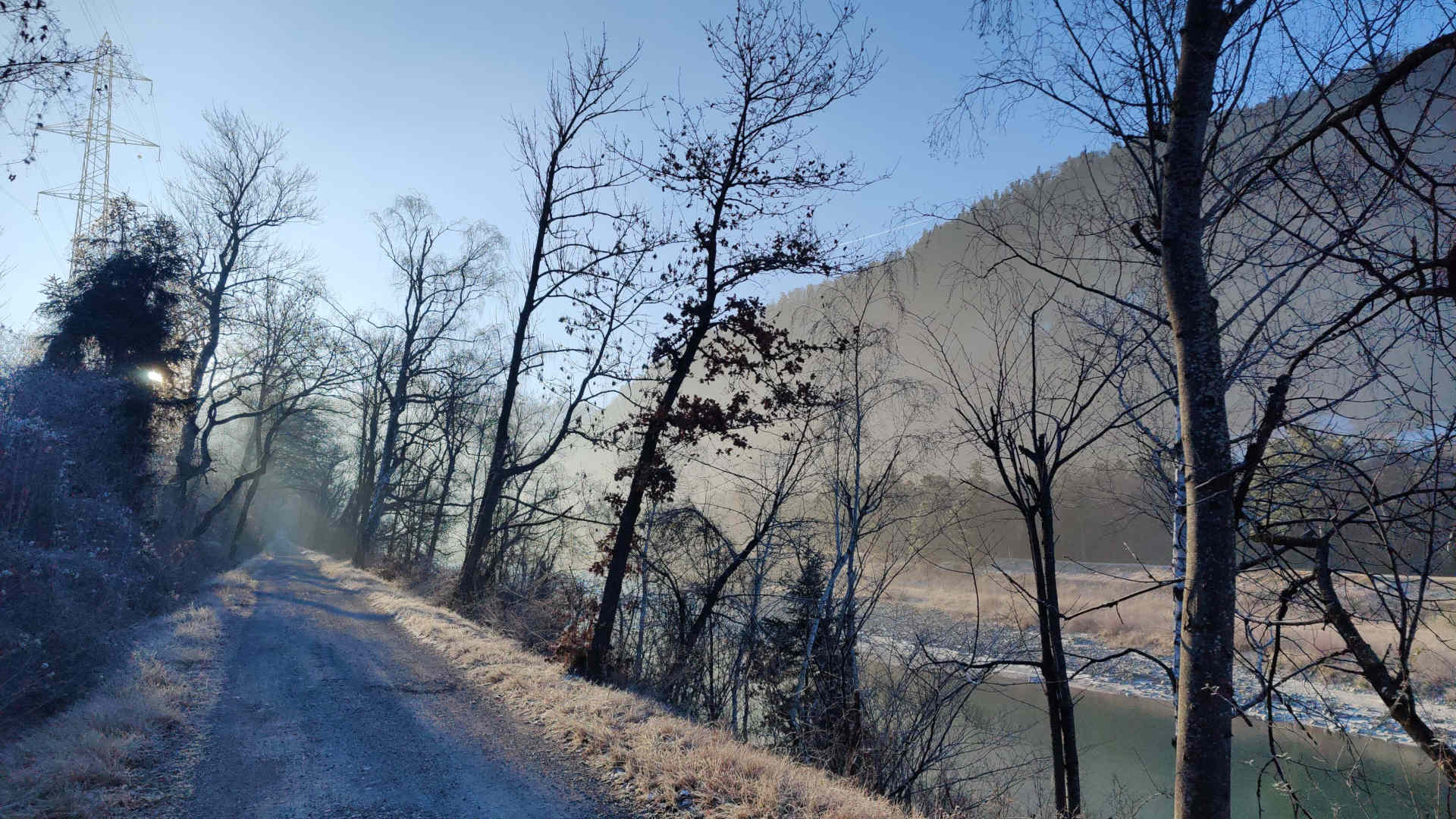So wandere ich auf dem Wander- und Radweg auf schattigen und bitterkalten Pfaden. Schon mit dem Velo ist die Passage eher seltsamer Natur. Da sind die Tunnels, die grossen Steinfangnetze, das massive, aber schmale Mauerwerk, das den Langsamweg vom Schnellverkehr trennt. Die Autos brausen vorbei.